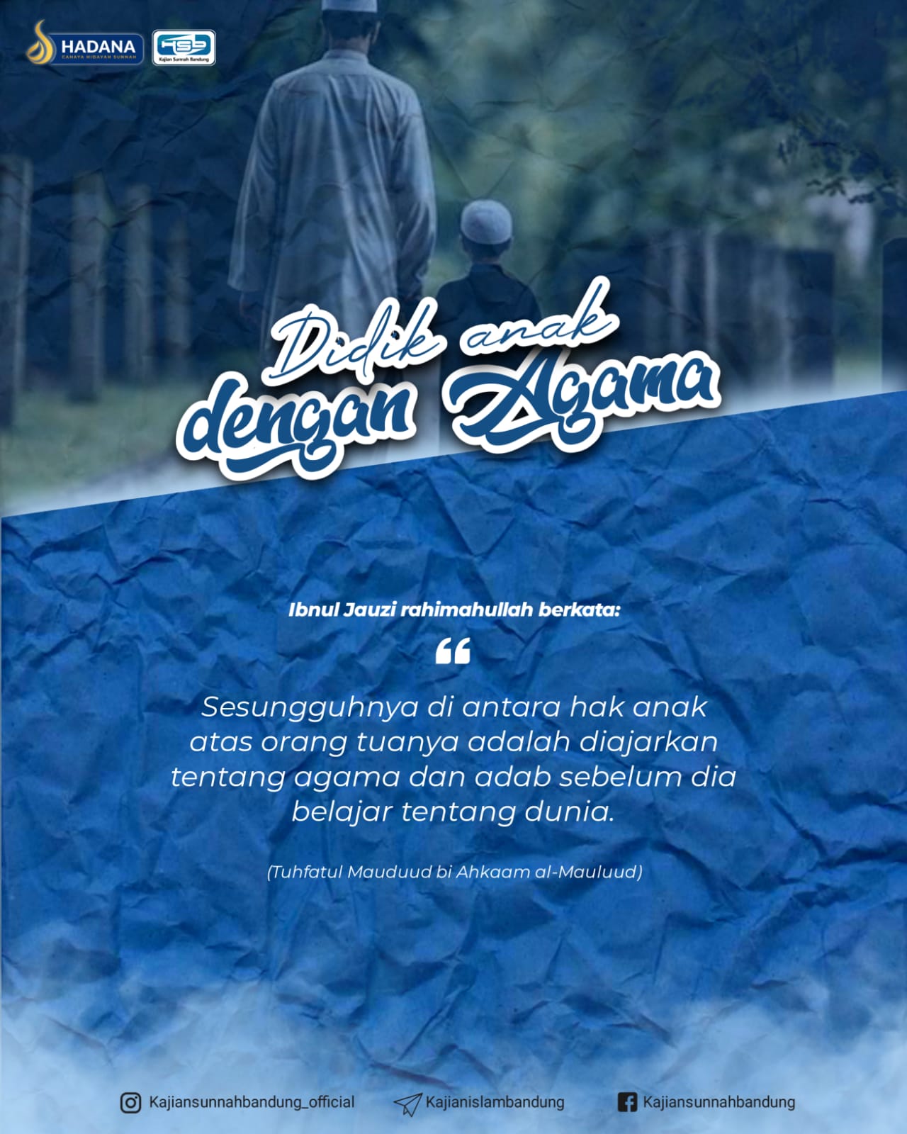 “Sesungguhnya di antara hak anak atas orang tuanya adalah diajarkan tentang agama dan adab sebelum dia belajar tentang dunia.” (Tuhfatul Maulud bi Ahkaam al-Maulud, hal. 229)
